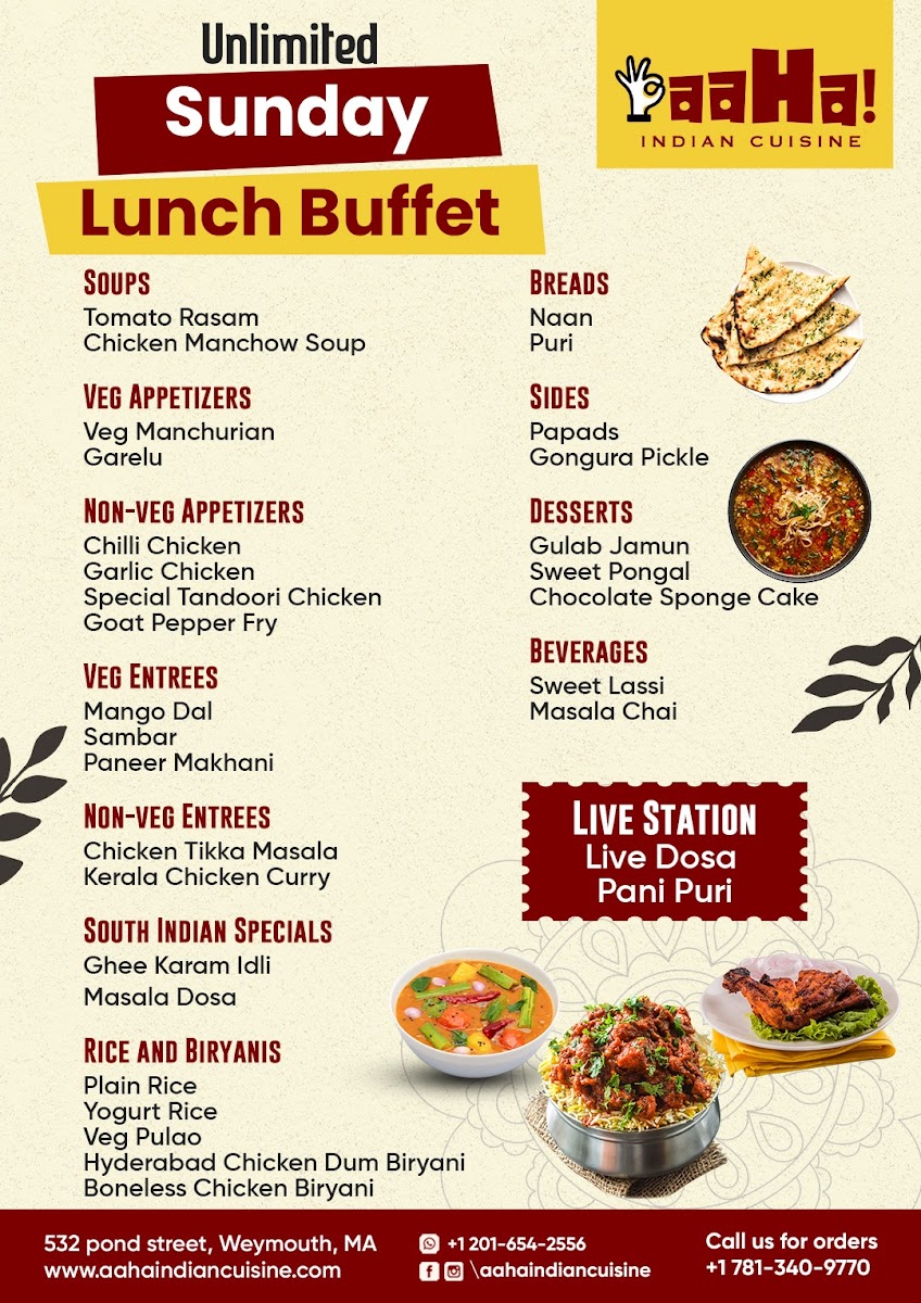 Discover the vibrant flavors of India at Aaha Indian Cuisine, conveniently located in Weymouth, MA. Renowned for its weekend buffet, Aaha offers an extensive selection that caters to every palate—whether you prefer vegetarian delights or rich non-vegetarian dishes.